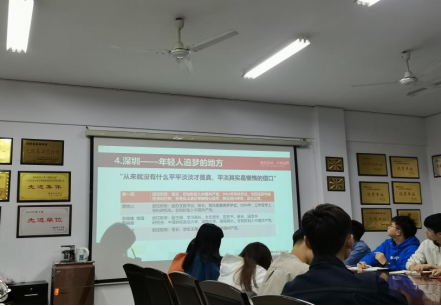 张陈武老师由近期前往深圳考察就业市场的经历,引出党课的主题—学习深圳“闯”“创”精神,勇担时代神圣使命。张老师围绕“我眼中的新一代深圳人”“深圳的成绩”等方面发表了讲话。