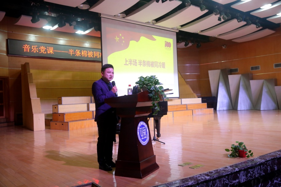 音乐党课分为上、下半场两个部分,上半场:半条棉被同冷暖;下半场:一江碧水竞风流。课程从四条主线展开,围绕“实事求是,将真理本土化” “人民情怀,走好新时代的长征路” “精准扶贫,乡村振兴,建设美丽中国” “守护一江碧水,融入长江经济带”等内容,用经典的红色音乐作品,将音乐艺术与党课有机融合,诠释党的性质宗旨,再现党的奋斗历程,赞颂党的辉煌业绩。