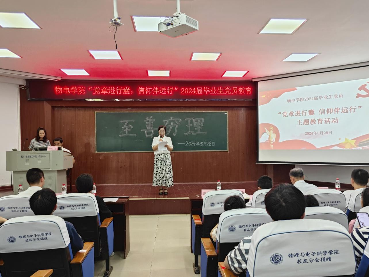 5月28日下午,公司党委在6栋学术报告厅开展“党章进行囊,信仰伴远行”2024届毕业生党员教育活动。公司党委委员、教师党员、员工党员、入党积极分子和团学代表参加,党委副书记石红芳主持。