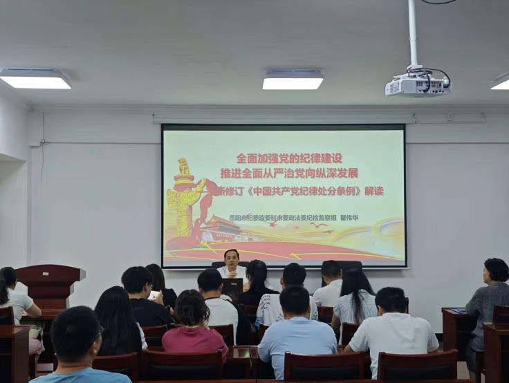 校园网讯 为深入推进党纪学习教育,进一步教育引导全公司党员、干部学纪、知纪、明纪、守纪,6月25日下午,岳阳市纪委监委驻市委政法委纪检监察组组长瞿伟华应邀来公司做新修订《中国共产党纪律处分条例》专题辅导报告。全体师生党员参加,公司党委书记周畅主持。