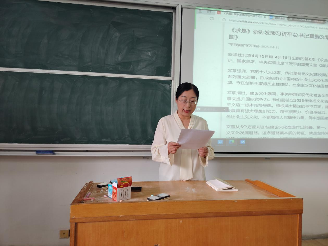 第一议题学习中,石红芳领学了《求是》杂志将于4月16日发表习近平总书记重要文章《加快建设文化强国》,解读了建设文化强国的内涵和重要性。