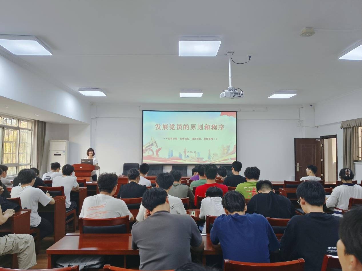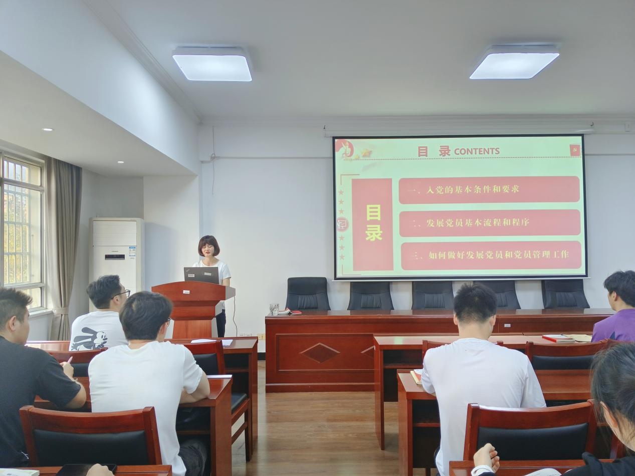 4月18日下午,太阳成集团tyc122cc组织员何小娅以“发展党员的原则与程序”为题讲授党课,第52期入党积极分子参加学习。
