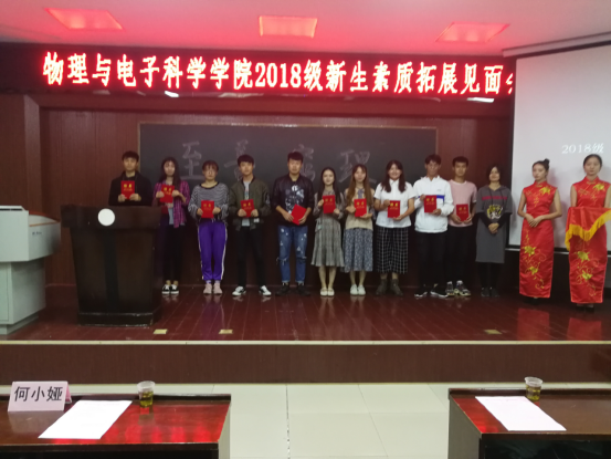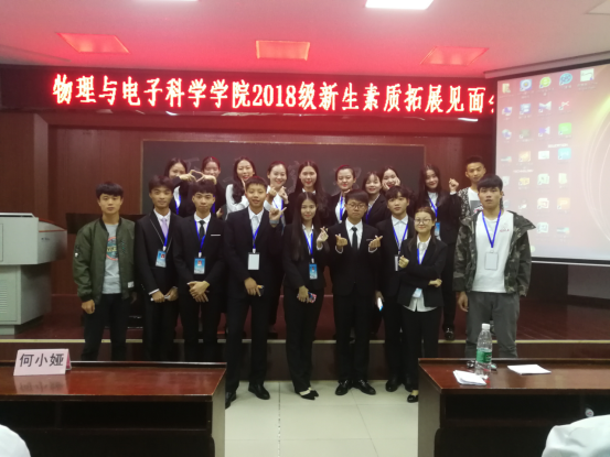 9月28日,太阳成集团tyc122cc于物电楼学术报告厅召开18级新生素质拓展见面会,出席大会的有团总支书记何小娅,第九届团学分会主席吴松俊,副主席赵峰,以及各个部长,参加大会的有18级新生。
