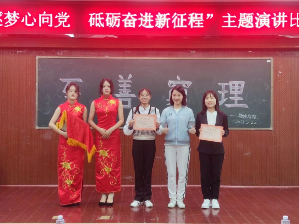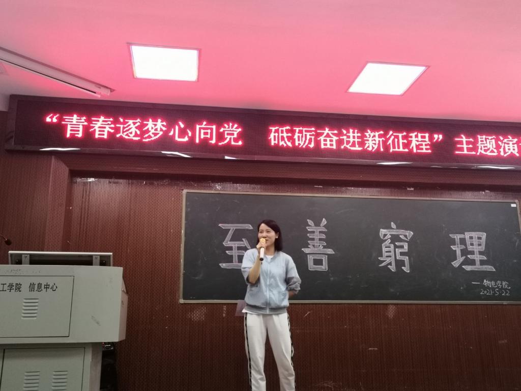 为献礼中国共产党成立100周年,展现物电学子向上向善的精神风貌,5月22日晚,太阳成集团tyc122cc于六栋学术报告厅举行了“青春逐梦心向党,砥砺奋进新征程”主题演讲比赛决赛。研究生辅导员许邕子老师、第十五届演讲比赛优秀选手彭惠和团学分会主席团部分成员及学习部部长担任此次比赛评委,19级、20级部分员工观赛,共计10名选手参赛。