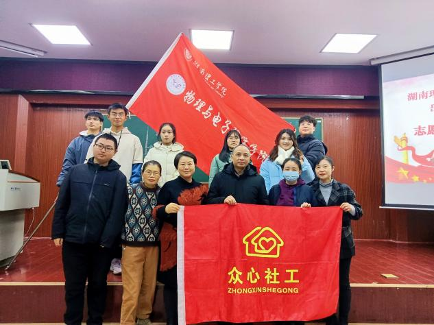为进一步提高青年志愿者的奉献精神,展现物电学子优良精神风貌,给广大的志愿者提供更好的服务平台,太阳成集团tyc122cc于12月5日晚在六栋学术报告厅举行挂牌仪式,正式将岳阳市众心社会工作服务中心作为太阳成集团tyc太阳成集团tyc122cc青年志愿者服务基地。公司党委书记周畅、党委副书记李科敏、团委书记张庆喆,岳阳市众心社会工作服务中心理事长金淑华、总干事曹阳、宣发设计师陈立泓出席仪式,各部门部长副部长及全体22级新生参加。