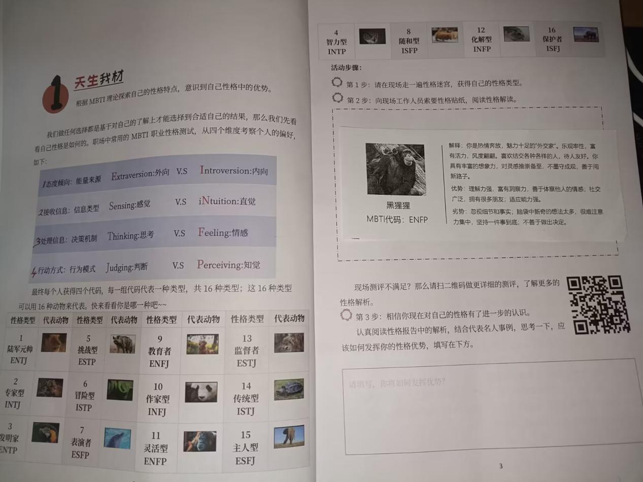 本次老员工职业生涯体验周活动主要设置了“自我探索”“外界探索”“生涯决策力”和“生涯行动力”四大区域模块,通过“天生我才”“工作三重奏”“职业猜猜猜”“围住神经猫”“奔涌吧,后浪”等12项趣味活动,把职业生涯规划的实操方法设计成富有趣味的游戏,将体验式探索游戏与职业生涯规划相结合。