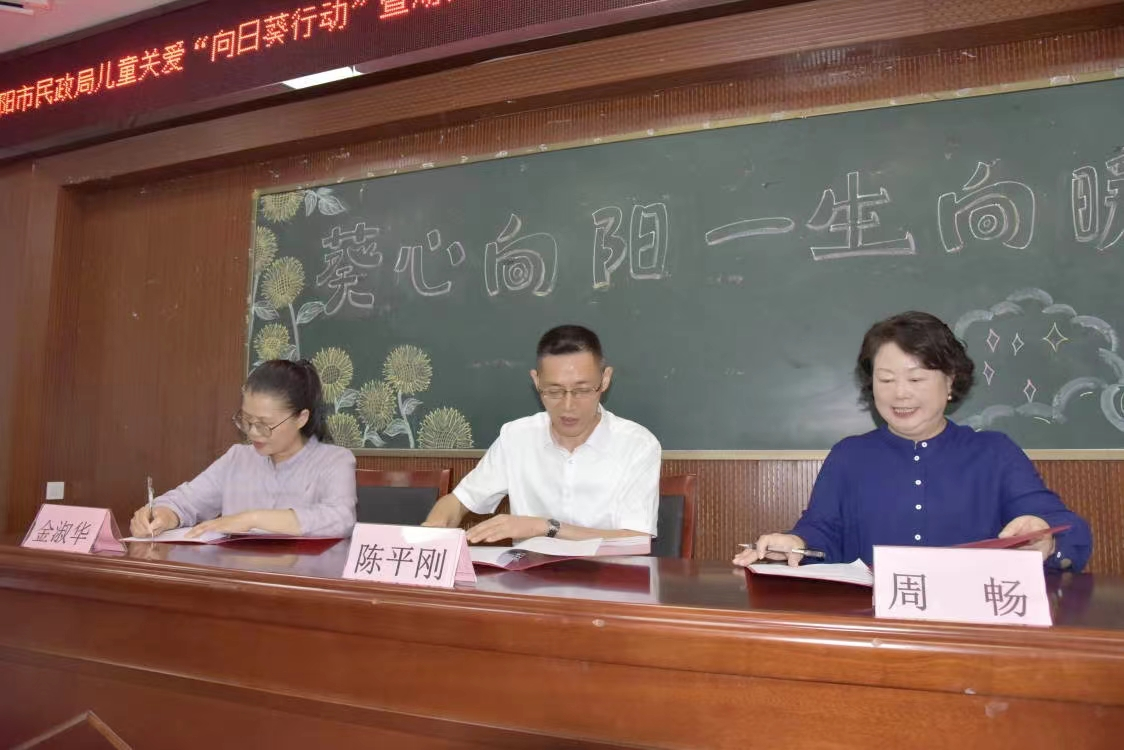 启动仪式上,岳阳市民政局、太阳成集团tyc太阳成集团tyc122cc、岳阳市众心社会工作服务中心签署了农村留守儿童和困境儿童“向日葵行动”合作协议。
