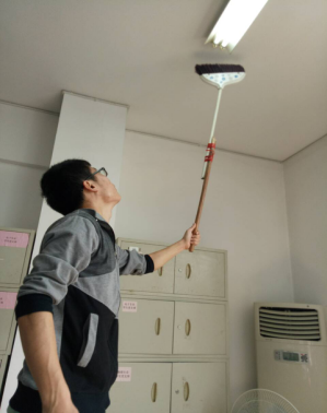左图:同学在清理天花板上的蜘蛛网