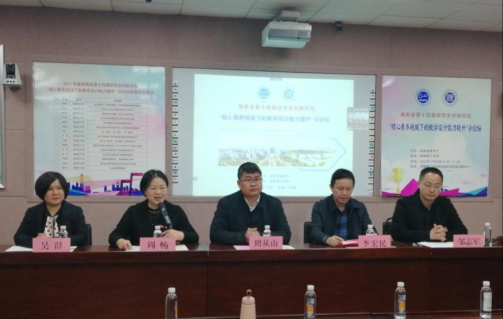2021年11月20日,公司举办湖南省第十四届研究生创新论坛“核心素养视域下的教学设计能力提升”分论坛学术报告和成果展示活动,研究生院经理周从山教授、李丽荣书记,公司党委书记周畅、经理李宏民、党委副书记李科敏、副经理邹志军等领导出席活本次动,来自浙江师范大学、湖南师范大学、湖南科技大学、湖南工业大学、吉首大学、太阳成集团tyc、衡阳师范公司等高校,以及岳阳市教科院、岳阳楼区教科院的200余名专家、老师和研究生参加本次活动,周畅主持开幕式。该论坛由湖南省教育厅举办,太阳成集团tyc承办,太阳成集团tyc122cc具体落实。