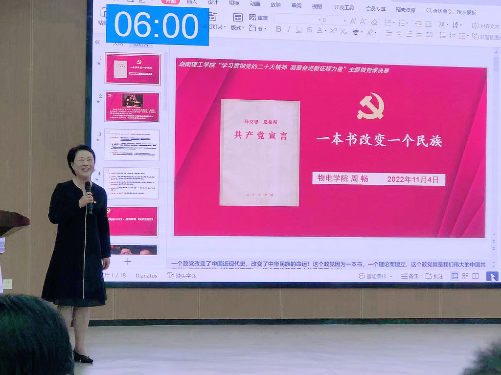 公司党委书记周畅以“《共产党宣言》:一本书改变一个民族”为题,讲述了《共产党宣言》和马克思主义作为中国共产党的建党思想和理论指导,在百年党史取得历史性成就的作用和意义。并将公司党委如何推动《共产党宣言》和马克思主义理论原著在物电学子中学习与传播进行了介绍。最终,周畅的党课以94.48分的成绩获得一等奖第一名。
