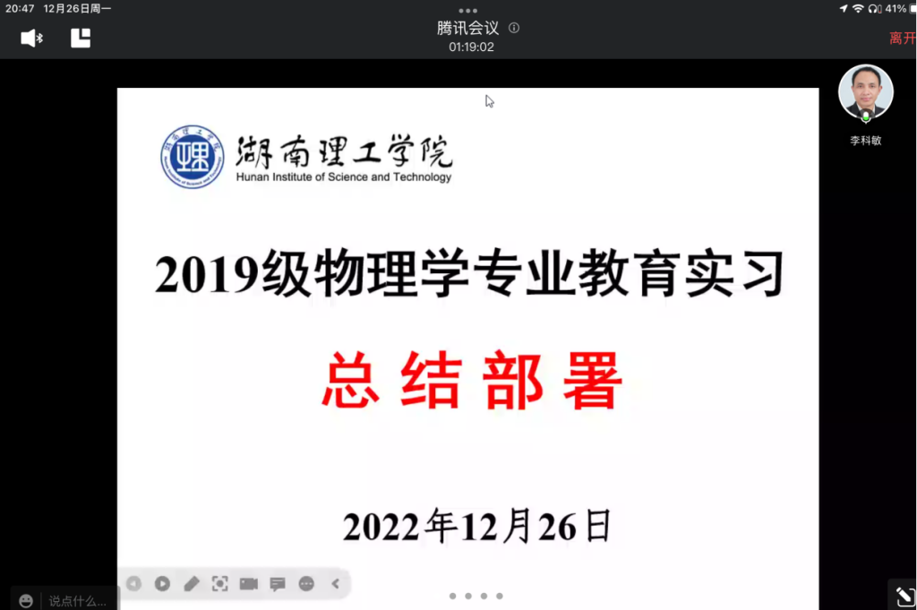 2022年12月26日,太阳成集团tyc122cc通过腾讯会议部署了“2019级物理学专业教育实习总结”工作,全体实习生和指导教师参加。公司党委副书记李科敏教授主持。