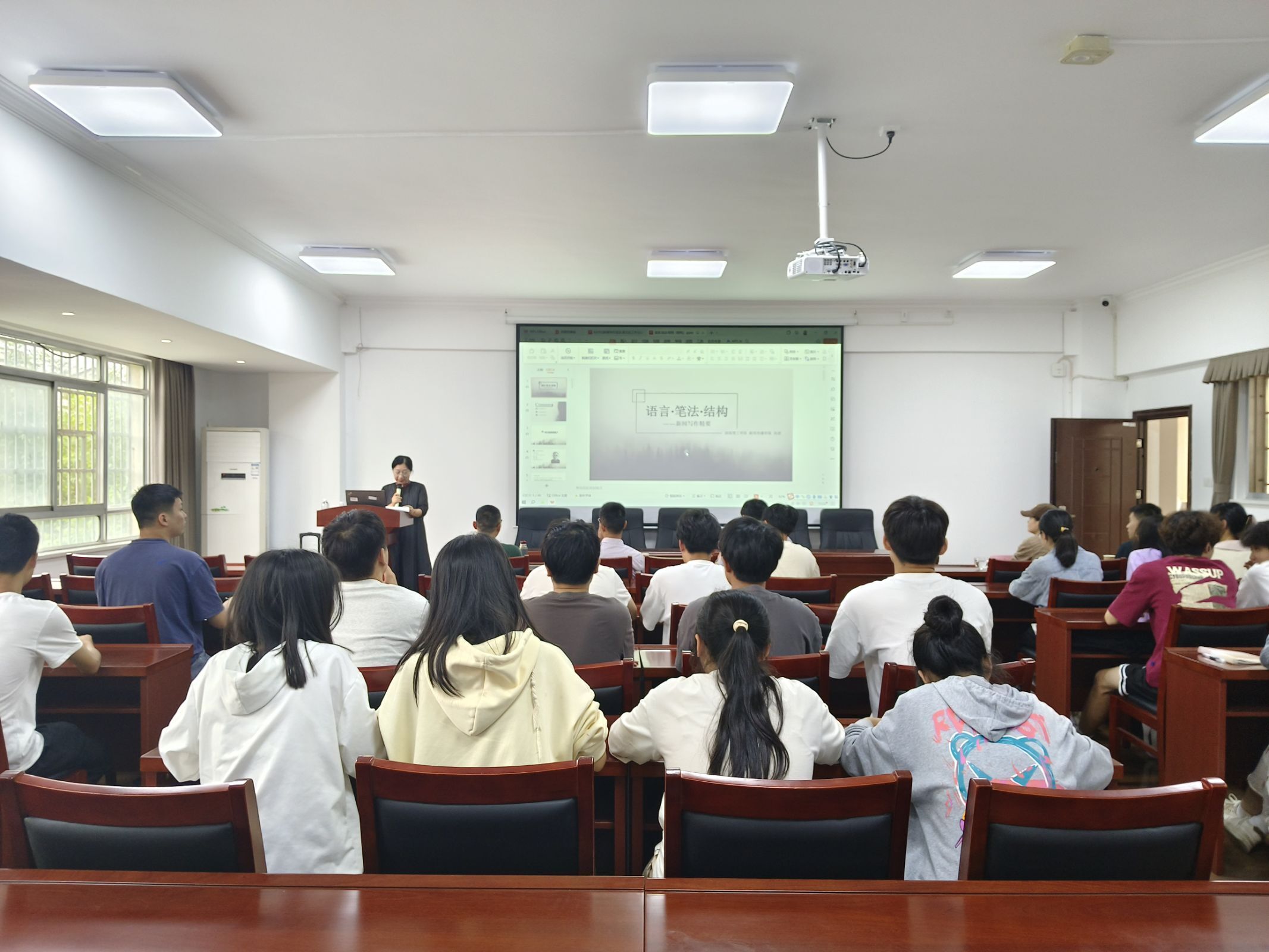 肖涛以《语法、笔法、结构——新闻写作精要》为题,从何为新闻语言、何为新闻笔法、何为新闻结构三个方面讲授,他从新闻的六要素展开,讲到了新闻与评论的区别,如何用事实说话,新闻语言的特征有哪些,如何使用“白描”语言,具有极强的针对性、指导性、实践性。