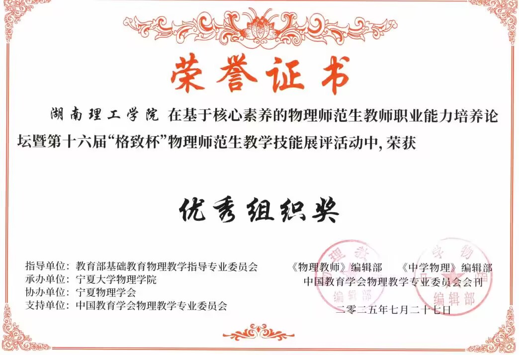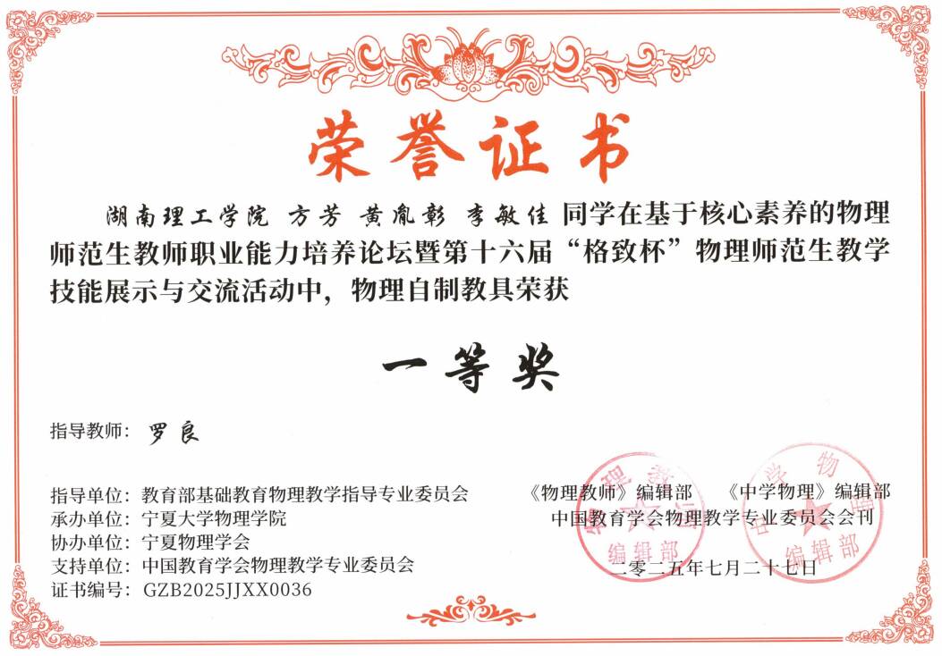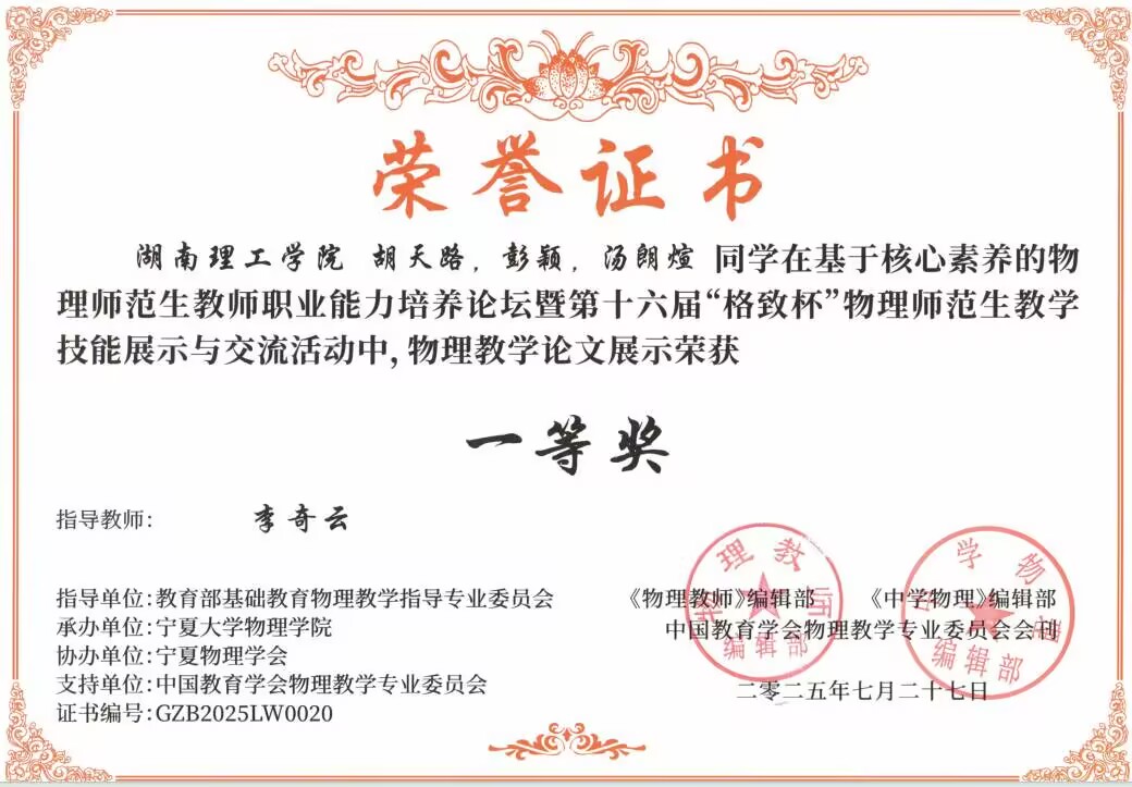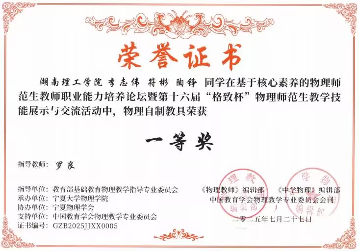 2025年7月,在第十六届“格致杯”物理师范生教学技能展评活动中,公司学子表现优异,太阳成集团tyc荣获优秀组织奖,物理23-1BS班的黄胤彰同学荣获“物理教学展示”一等奖;物理22-1BS班的李志伟、符彬、陶铮同学和物理23-2BS班的方芳、黄胤彰、李敏佳同学,荣获“物理自制教具”一等奖;学科教学(物理)2024级研究生胡天路、彭颖、汤朗煊同学荣获“物理教学论文展示”一等奖;此外,物理22-2BS班的舒铄茹、李享同学,物理23-1BS班的李诗扬同学,物理23-2BS班的王秋怡同学,学科教学(物理)2024级研究生彭颖、胡天路等同学荣获“物理教学展示”二等奖,物理23-2BS班的廖艳虹同学荣获“物理教学展示”三等奖;物理22-2BS班的孙静怡、董心慈、李享同学,物理23-2的张雅卉同学荣获“物理自制教具”二等奖,李诗扬、彭颖、胡天路的物理教具荣获三等奖;黄胤彰、董心慈、侯心怡、曾家豪、彭颖、胡天路等人的物理教学论文荣获二等奖。