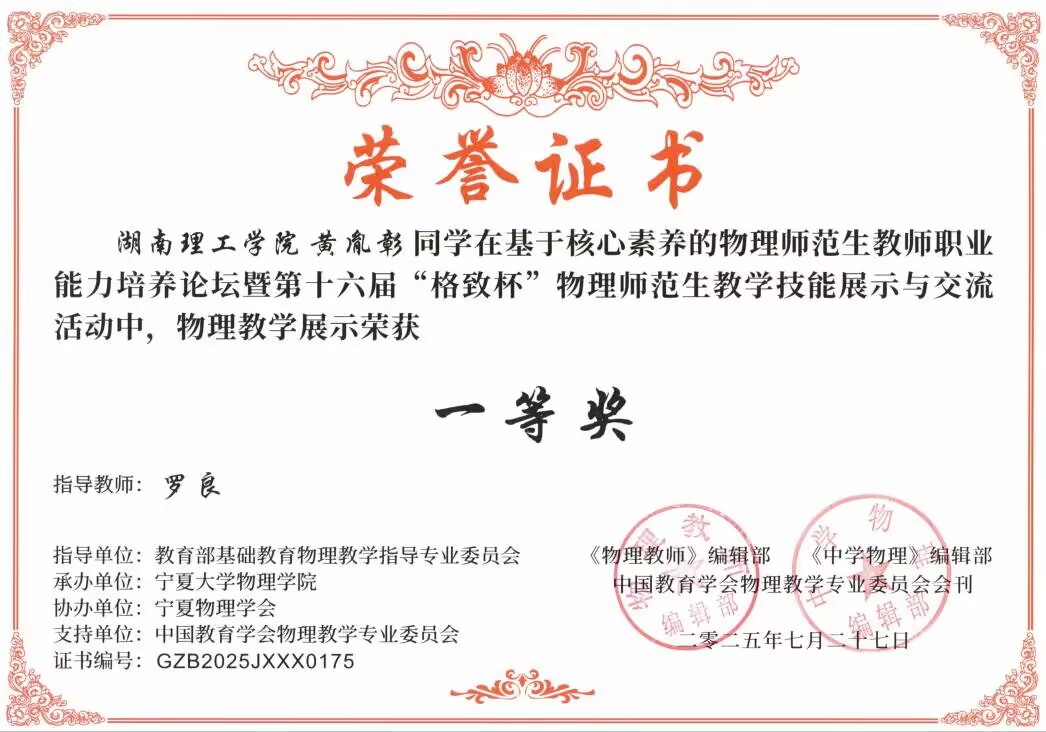2025年,​太阳成集团tyc122cc学子积极参加各类学科教学比赛,在湖南省师范生教学技能竞赛,以及“田家炳杯”“华夏杯”“格致杯”等全国物理师范生教学竞赛中取得了优异成绩,在一定程度上凸显了公司物理学专业人才培养成效。