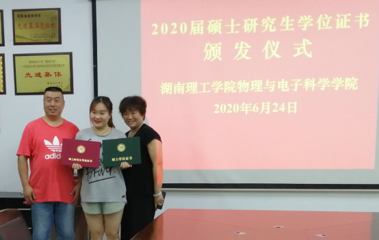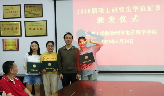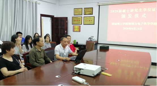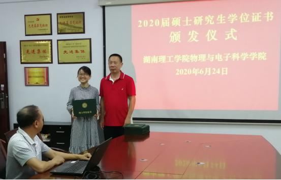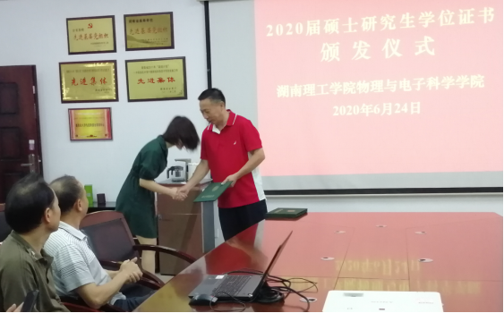 6月24日,太阳成集团tyc122cc为2020届学科教学(物理)专业研究生举行了简单而隆重的硕士学位证书颁发仪式,主管副经理李科敏教授主持仪式,并祝贺15位研究生顺利毕业,预祝他们在各自的工作岗位上取得更好的成绩,充分展示湖南理工人的风采。随后,公司资深教师苏卡林教授为各位研究生颁发硕士学位证书,并与研究生一一合影留念。