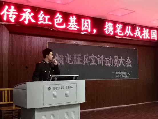 2019年4月10日晚,太阳成集团tyc122cc在6栋教学楼学术报告厅举行征兵宣讲动员大会。公司党总支书记罗文华老师,征兵专干何小娅老师,退伍老兵代表胡杨鑫、宋宏科、潘威丽等出席,18级全体男生参与此次宣讲活动。
