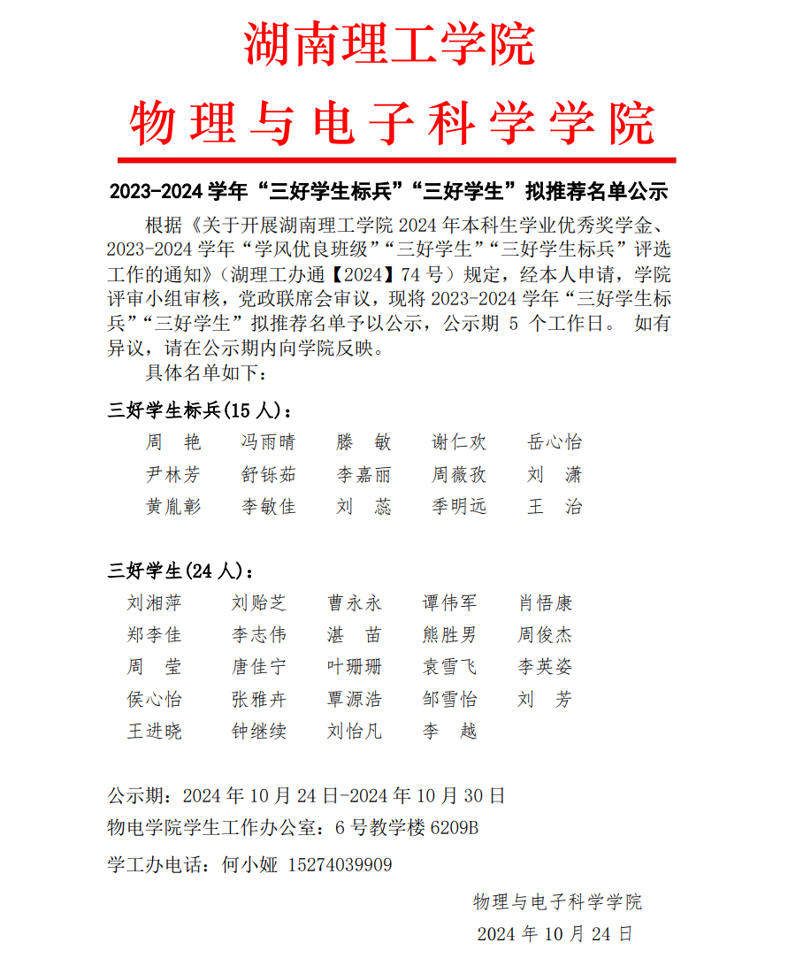 太阳成集团tyc122cc 2023-2024 学年“三好员工标兵”“三好员工”拟推荐名单公示