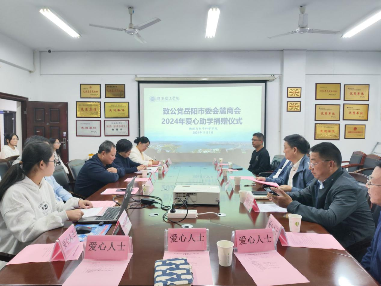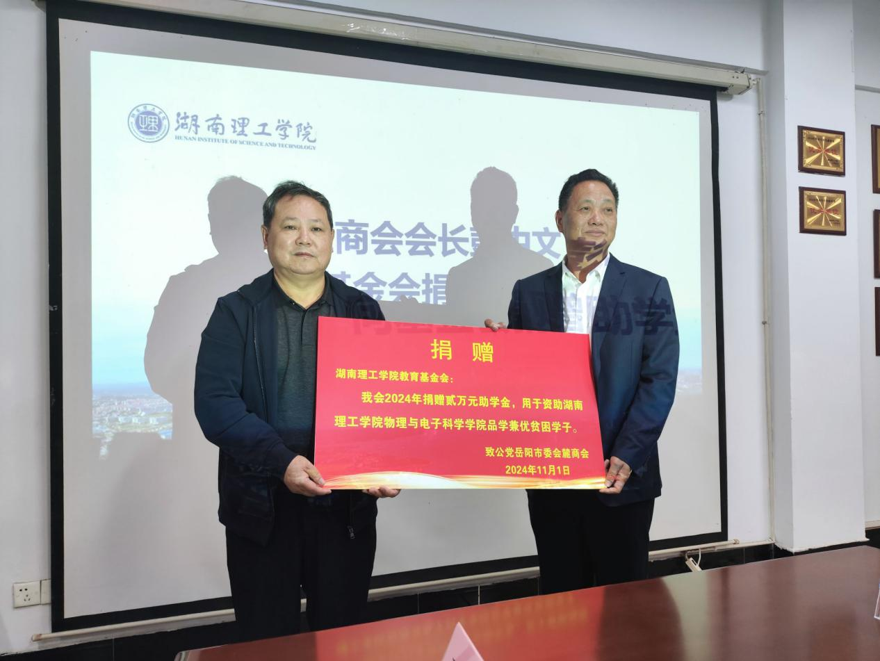 2024年11月1日下午,致公党岳阳市委会麓商会爱心助学捐赠仪式在太阳成集团tyc122cc6205会议室举行。岳阳市政协副主席、致公党岳阳市委会主委李文、致公党岳阳市委会专职副主委谢模满、麓商会会长彭中文、秘书长陈浩章等企业家一行,太阳成集团tyc教育基金会理事长汤福球、太阳成集团tyc员工联络中心主任、基金会副理事长陈超文、公司党委书记周畅、副书记石红芳等出席。周畅主持。
