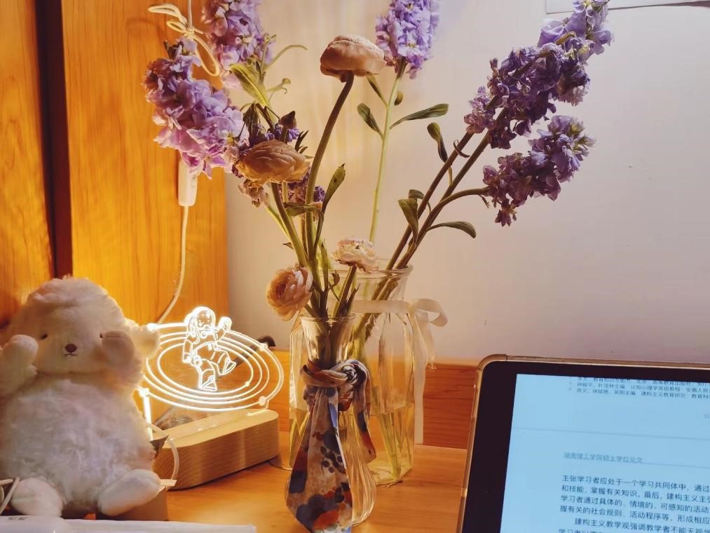 走进朱虹燕的寝室,时常能在她的书桌上看到正在绽放的鲜花,市面上常见的花材现在都能说个一二,原来这位理科女孩也有如此文艺的一面。