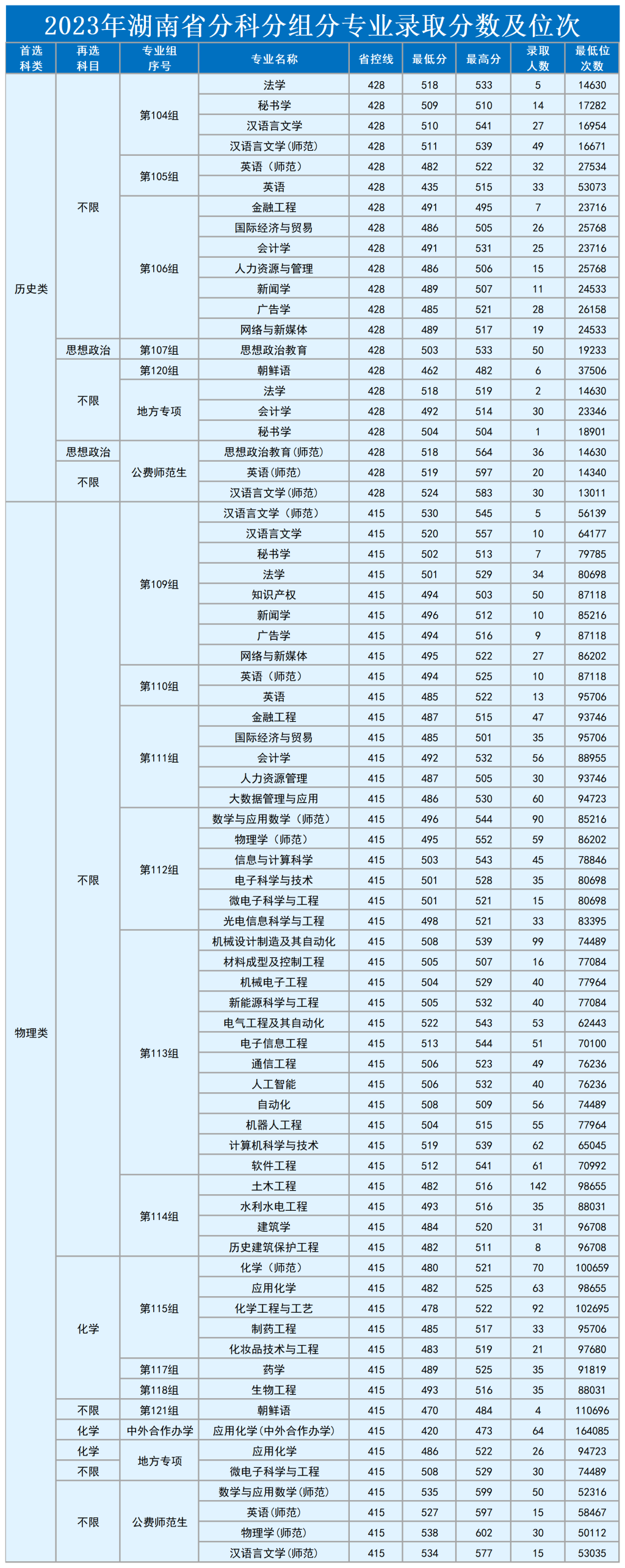 太阳成集团tyc2023年湖南省分科分组分专业录取分数及位次